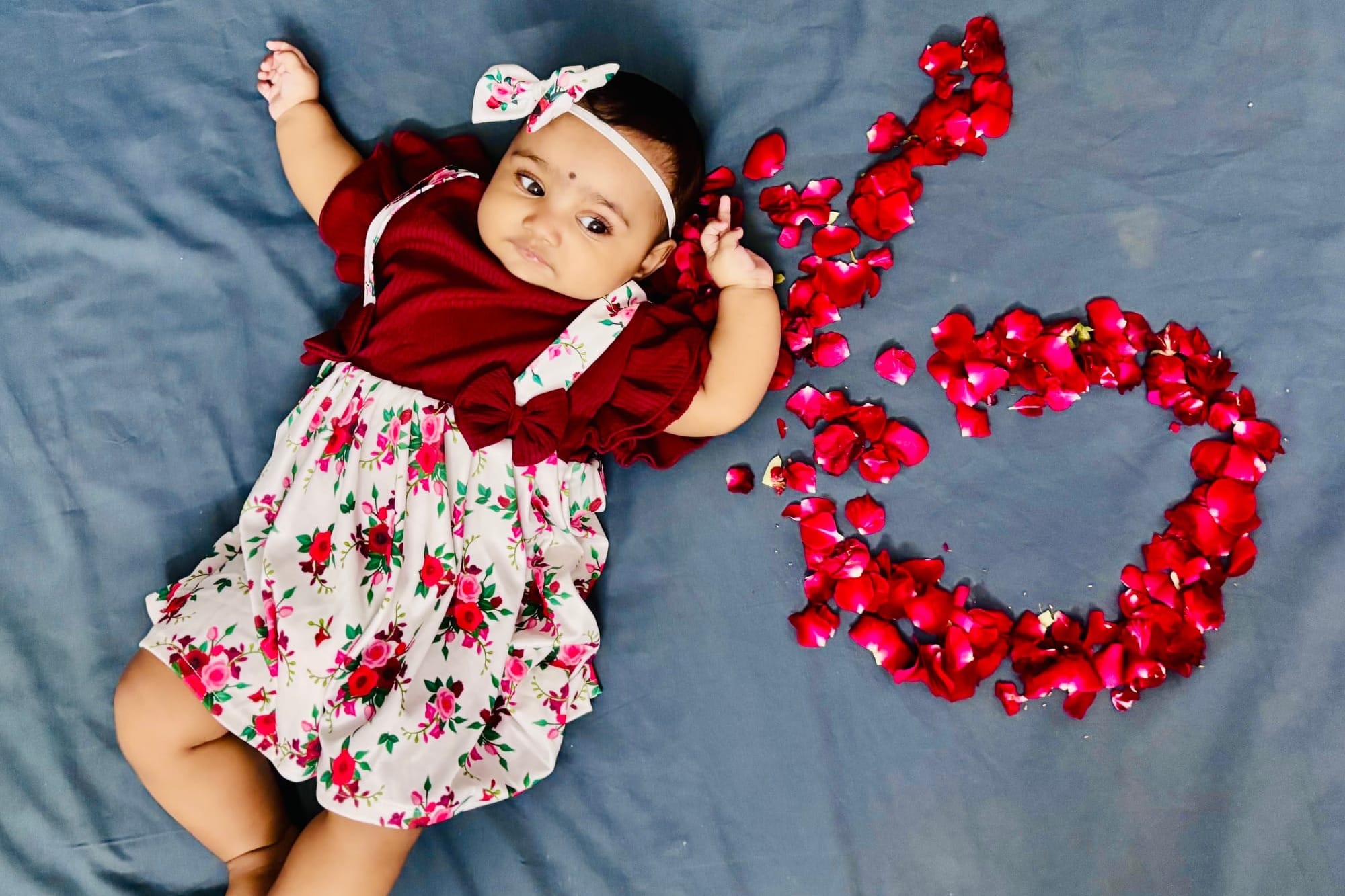 Lovely once again took the lead. She picked red rose petals to form the number six. No plastic props, no glittery frames. There were just fresh petals and a clean sheet. Anika was dressed in a floral outfit that matched the whole vibe without even trying. Her maroon top and white floral frock gave the photo a soft festive feel, but without making it look overdone.